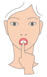 前歯で指を軽く噛み、下あごが動かないように固定します。そのまま「い〜」といい、下唇を下げます。下げきったら5秒キープし、その後、ゆっくりと元に戻します。