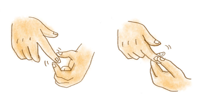 爪を親指と人差し指で挟み、上下左右から揉みましょう。両手両足行うと、末梢の血行を促します。